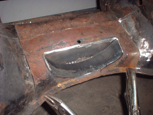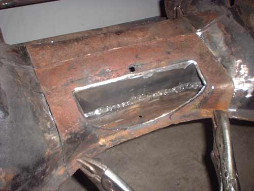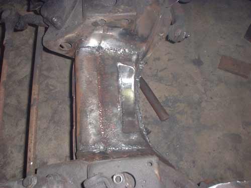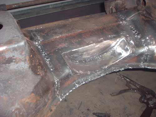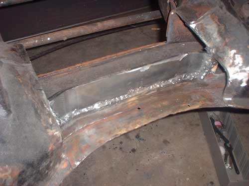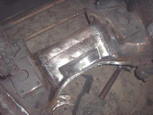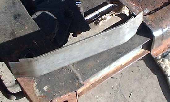 Luckily, the torch wielding "mechanic" left enough of the flange of the original internal web to graft onto, and the new 3/16" thick web I created had sufficient length to fit inside the existing, remaining cross-member so as to structurally reconstruct it.