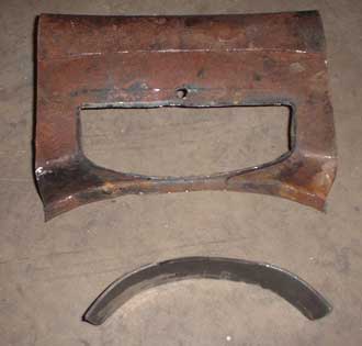 I discover that with the motor 4" further back, and by using the older, short Chevy water pump and a single groove pulley ( no power steering for this puppy!), that the face of the pulley would be OVER 6" further back. With the aid of fellow OROC members Jim Sloan, Sloan Racing, and Paul Kort, I was able to come with a section of original cross-member from a cancer victim donor frame. After much discussion and head scratching, I fabricated a new center web and pulley cutout, and massaged the replacement piece to fit.